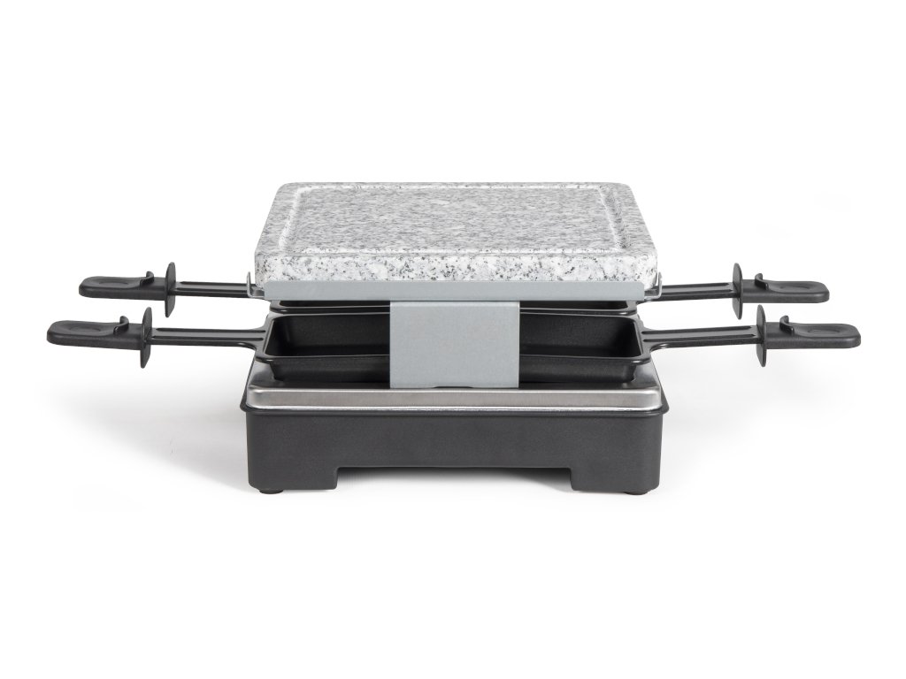 Kompaktní raclette gril pro 4 osoby je ideální pro společné stolování s rodinou nebo přáteli. Díky grilovací kamenné desce můžete připravovat maso, zeleninu nebo jiné přílohy, zatímco v raclette pánvičkách se zapéká sýr či další ingredience podle chuti.