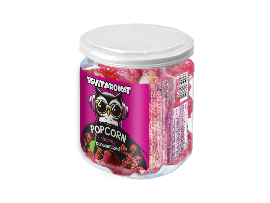 Sladký, karamelizovaný popcorn s příchutí třešní, balení 70g v praktické tubě.