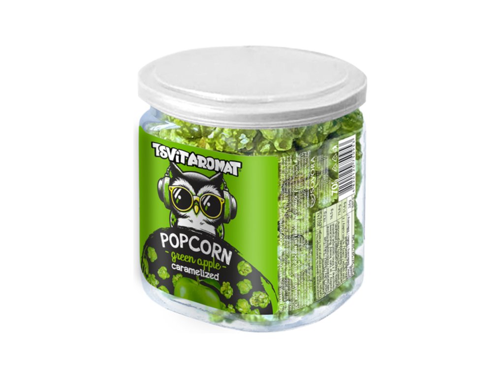 Sladký, karamelizovaný popcorn s příchutí zeleného jablka, balení 70g v praktické tubě.
